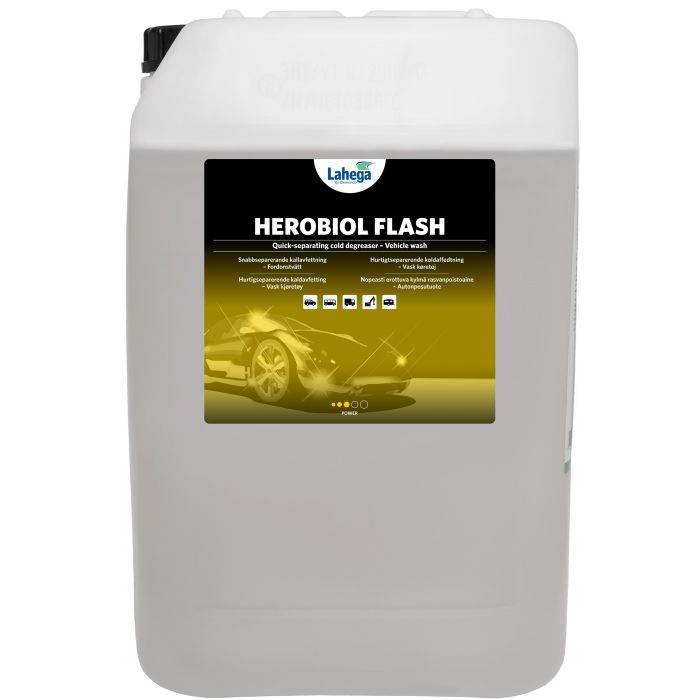 Herbiol Flash är ett snabbseparerande lågaromatiskt kallavfettningsmedel utan emulgator och med låg egenlukt. Det används vid borttagning av oljerik smuts, asfaltstänk, vägsalt m m på fordon och motorer och fungerar utmärkt som förtvättmedel i automattvättanläggningar. Herbiol Flash är användbart på våta ytor samt anpassat för nordiska vinterförhållanden. Produkten separerar extremt snabbt i oljeavskiljare.