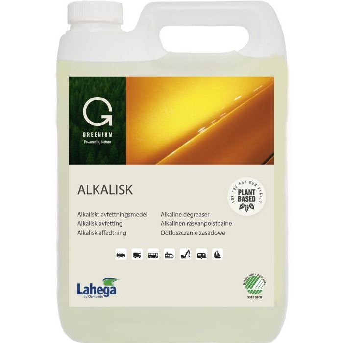 Lahega Greenium Alkalisk är ett kraftfullt, medelskummande alkaliskt avfettningsmedel baserad på Hållbara, Vegetabiliska och Förnyelsebara råvaror lämpligt för fordonstvätt. Löser snabbt och effektiv smuts såsom vägdamm, trafikfilm, vägsalt, bromsdamm, fett och insekter.