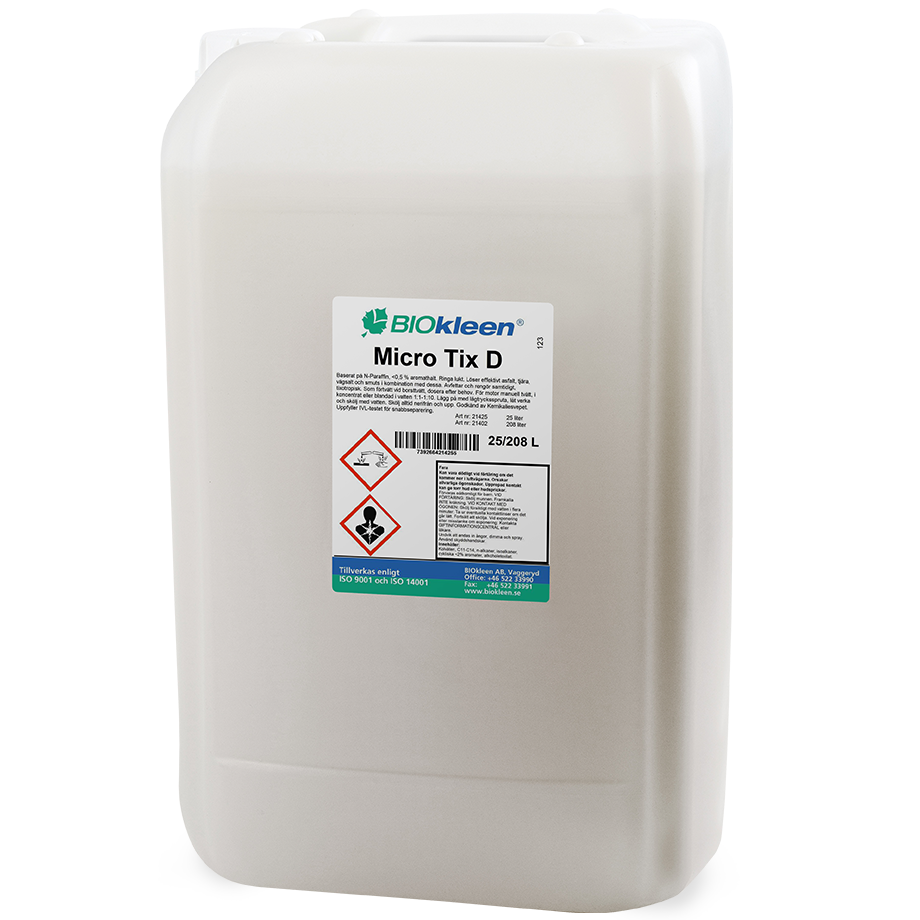 Micro Tix D är ett högkoncentrerat vattenbaserat tixotropt avfettnings-och rengöringsmedel. Baserad på av-aromatiserad lacknafta med max 0,5 % aromahalt. Fungerar på fuktiga ytor. Ringa lukt. Godkänd av Kemikaliesvepet. Micro Tix D är både avfettning och schampo i ett. Löser effektivt olja, tjära, asfalt, vägsalt, gammal fastbiten smuts mm. på nya och äldre person- och lastbilar, bussar, lantbruks- och entreprenadmaskiner, tåg, motorcyklar, motor- och maskindelar, verkstadsgolv, m.m Micro Tix D ”hänger kvar” och verkar utan att rinna av, renare tack vare bättre effekt. Skonsamt mot lättmetall och gummi och ett utmärkt fälgrengöringsmedel. Produkten finns i storlekarna 5L, 25L och 208L.